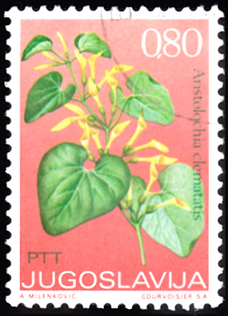 Diese Marke aus Jugoslawien (MiNr 1510) zeigt uns eine Gewöhnliche oder Aufrechte Osterluzei (Aristolochia clematitis).
