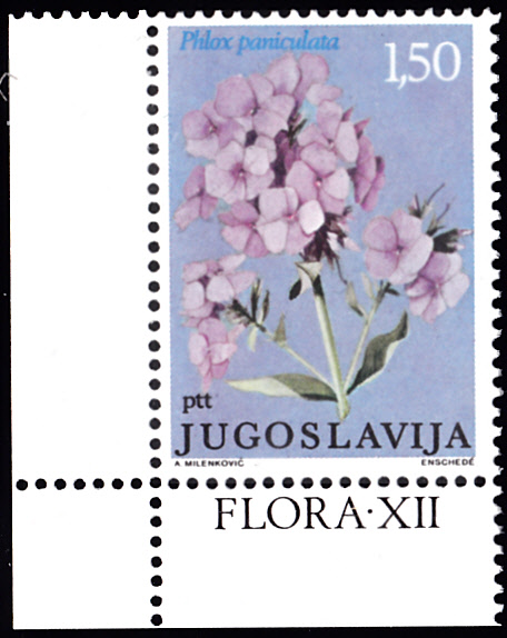 Auf dieser Marke aus Jugoslawien (MiNr 1676) wird eine Blüte des Hohe Stauden-Phlox (Phlox paniculata) gezeigt.