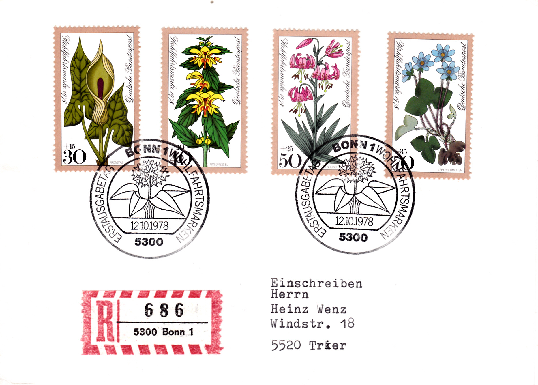 Diese Marke der Deutschen Bundespost (MiNr 985) bildet ein Gewöhnliches Leberblümchen (Hepatica nobilis) ab.