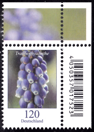 Auf dieser Marke der Deutschen Bundespost (MiNr 1062) sehen wir die Blüte einer Schopf-Traubenhyazinthe (Muscari comosum). Michel nennt sie Träubelhyazinthe (Muscari comosum).