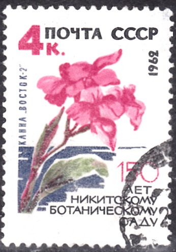 Auf dieser Marke aus der Sowjetunion (MiNr 2651) wird die Blüte der Canna "Wostok 2" (Canna indica hybr.), einer Zuchtform, gezeigt.