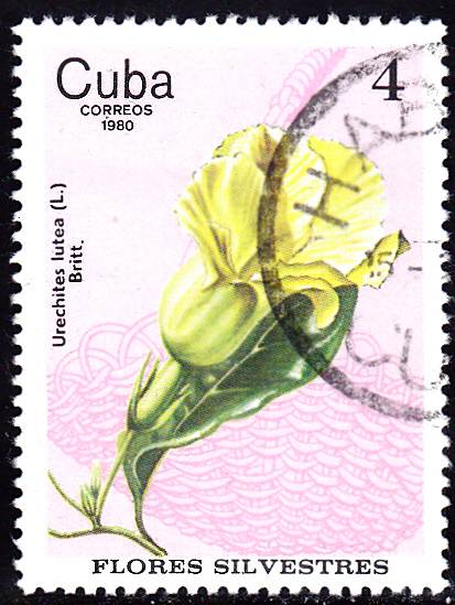 Auf dieser Marke aus Kuba (MiNr 2519) wird eine Blüte der Pentalinon luteum gezeigft. Auf der Marke ist eines der vielenb Synonyme (Urechites lutea) dieser Pflanzenart angegeben.