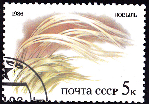 Auf einer Marke der Sowjetunion (MiNr 5574) aus einer Serie "Geschützte Pflanzen der russischen Steppen" ist Echtes Federgras (Stipa pennata) abgebildet.