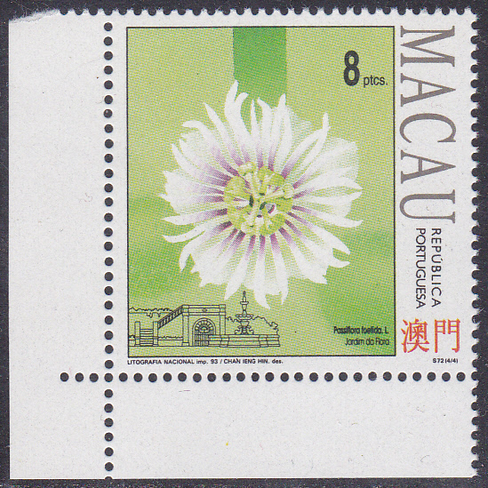 Diese Marke aus Surinam (MiNr 807) zeigt eine Blüte der Riesengranadilla (Passiflora quadrangularis).