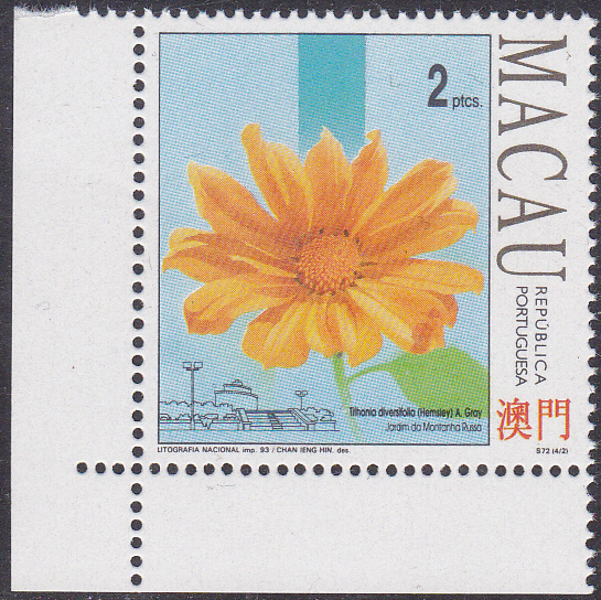 Auf dieser Marke aus Macau (MiNr 736) wird die Blüte einer Mexikanische Sonnenblume (Tithonia diversifolia) abgebildet.