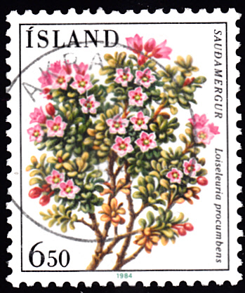 Hier eine Marke aus Island (MiNr 619) mit einer Gämsheide (Loiseleuria procumbens, Syn.: Kalmia procumbens).