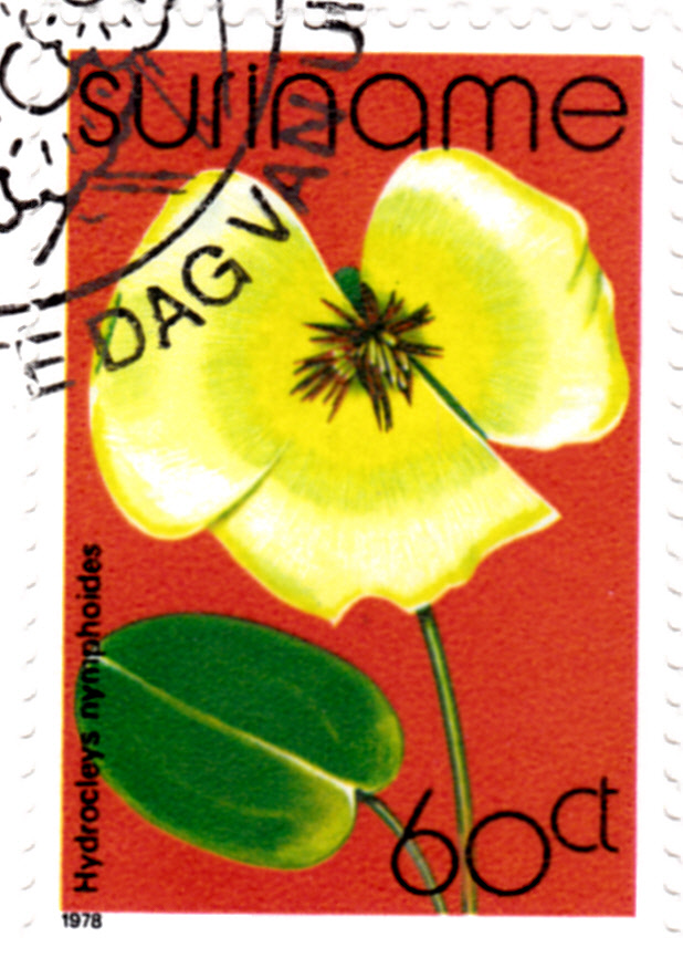 Auf dieser Marke aus Surinam (MiNr 810) wird die Blüte des Seerosenähnlichen Wassermohns (Hydrocleys nymphoides) gezeigt.
