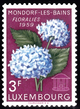 Auf einer Marke aus Luxemburg (MiNr 608) werden zwei Blüten einer Gartenhortensie (Hydrangea macrophylla) gezeigt.