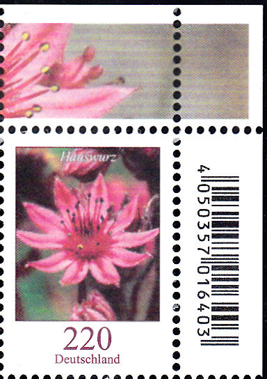 In der Dauerserie "Blumen" der Deutschen Post ist auch eine Marke (MiNr 3414) mit der Blüte einer Hauswurz (Sempervivum sp.) erschienen. Es handelt sich hierbei sicherlich um eine Zuchtsorte. Hier zeige ich ein Eckrandstück mit EAN-Code.