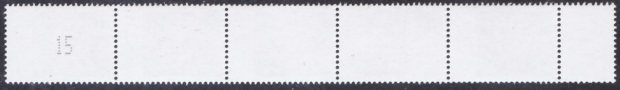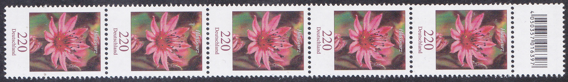 Diese Marke zu 220 Cent mit dem Motiv "Hauswurz" (MiNr 3414) ist auch in Rollen zu je 100 Stück erschienen. Hier zeige ich einen Sechserstreifen aus 5 Markern und einem Zwischenfeld mit EAN-Codierung.