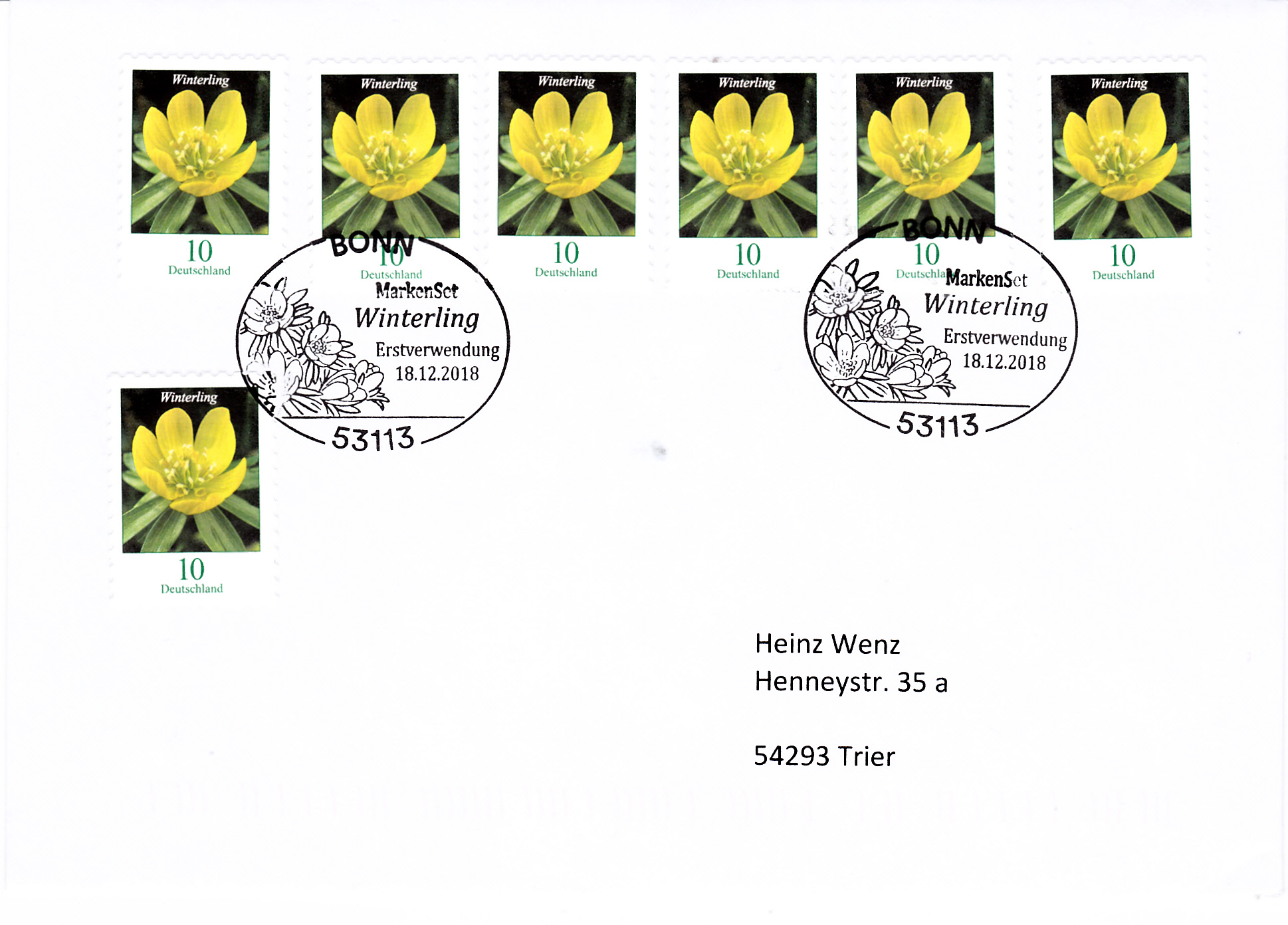 Auch für die selbstklebende Marke zu 10 Cent (MiNr 3430) gab es einen Erstverwendungsstempel. Hier ein Brief mit sieben Marken der selbstklebenden Ausgabe:
