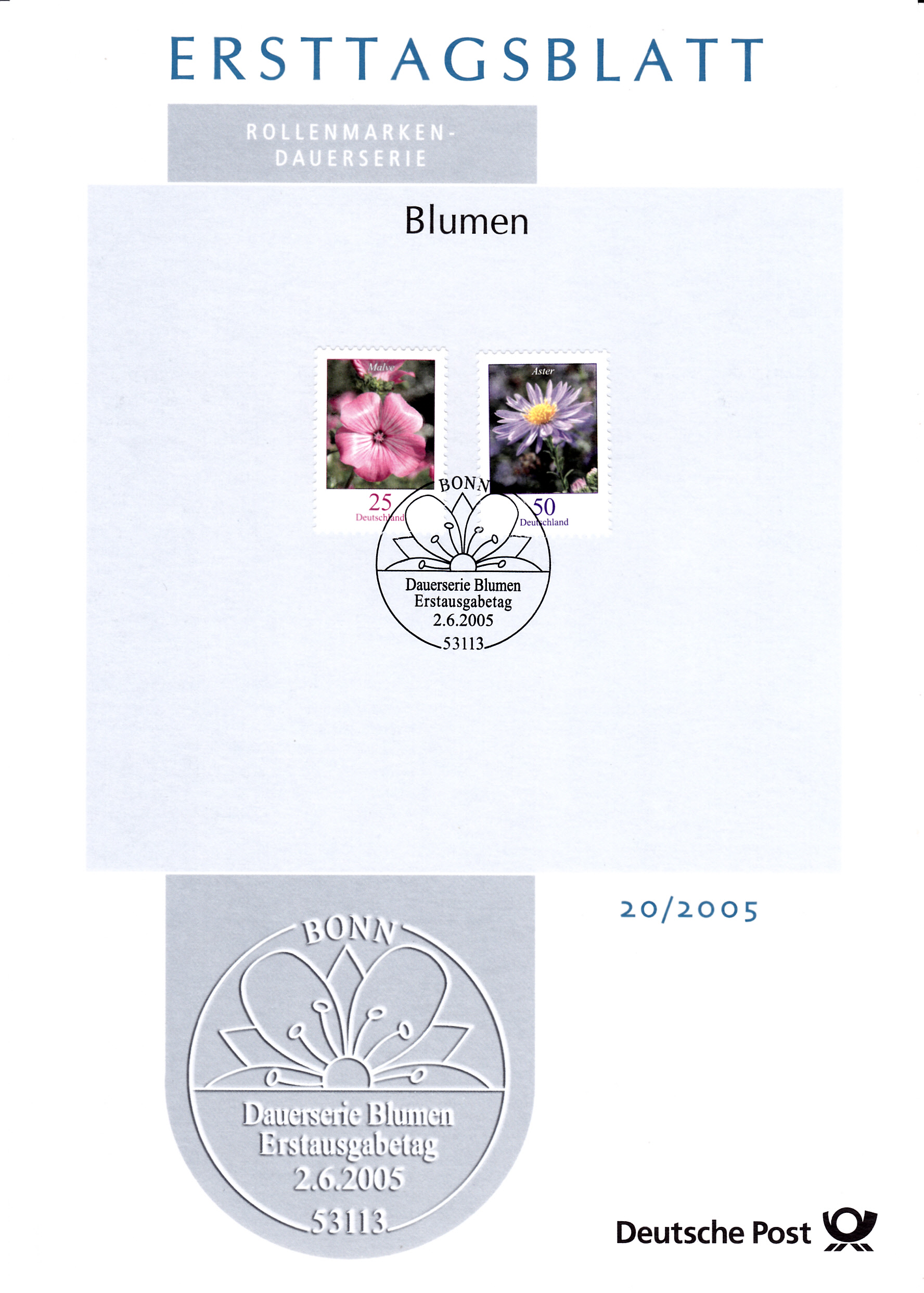 Es folgt ein Ersttagsblatt mit den beiden Marken der Dauerserie "Blumen" mit den Motiven Bechermalve (Lavatera trimestris) und Herbstaster (Aster novae). Auf der Rückseite der Ersttagsblätter findet man immer einige Informationen zum Markenmotiv.