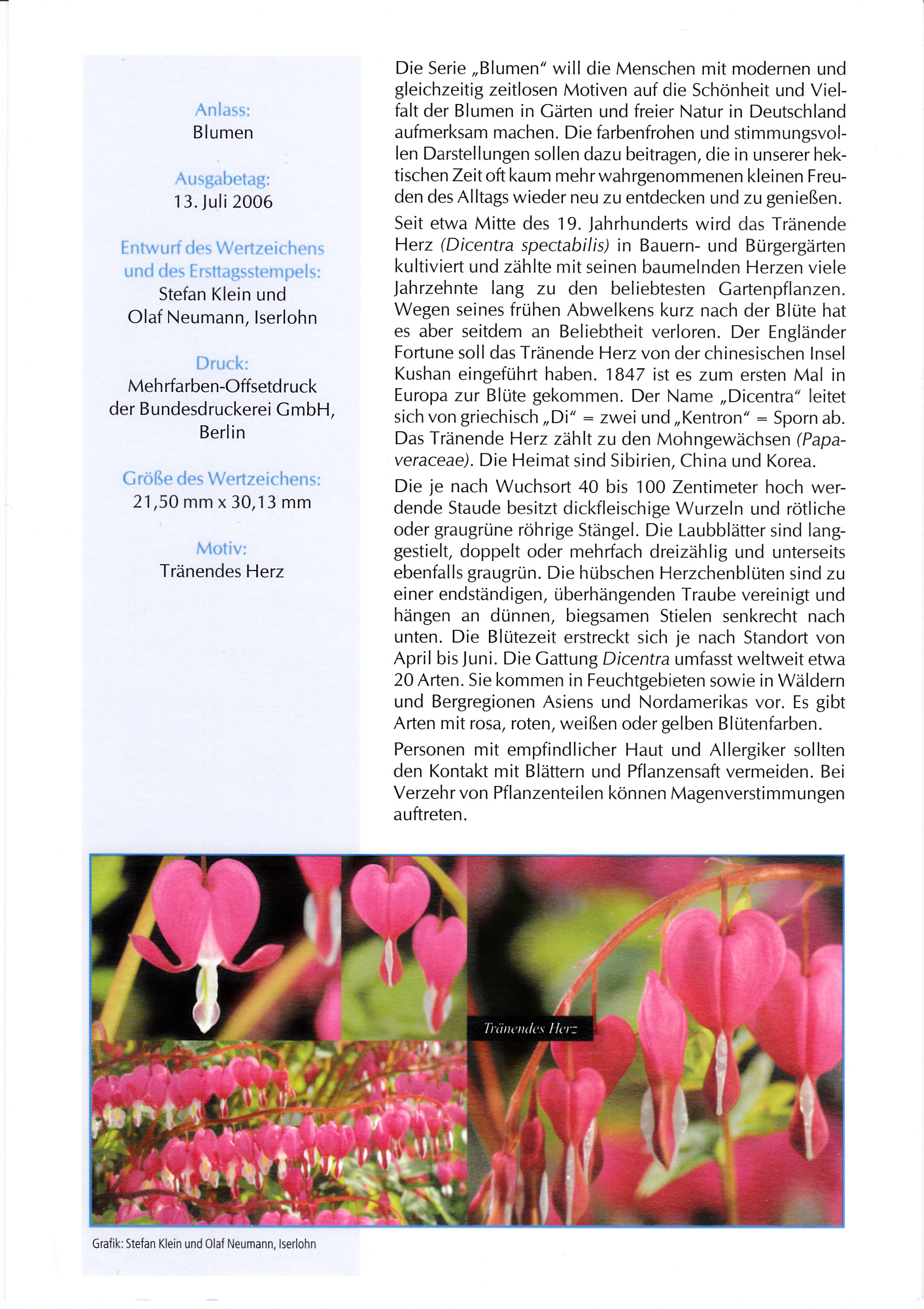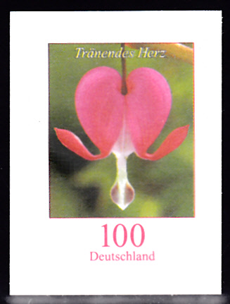 Hier auf dieser Marke aus der Serie "Gartenblumen" aus Jugoslawien (MiNr 1978) wird die Blüte von einem Tränenden Herz (Lamprocapnos spectabilis) gezeigt. Bei Michel wird noch der Name Flammendes Herz (Dicentra spectabilis) mit der alten lateinischen Bezeichnung angegeben.