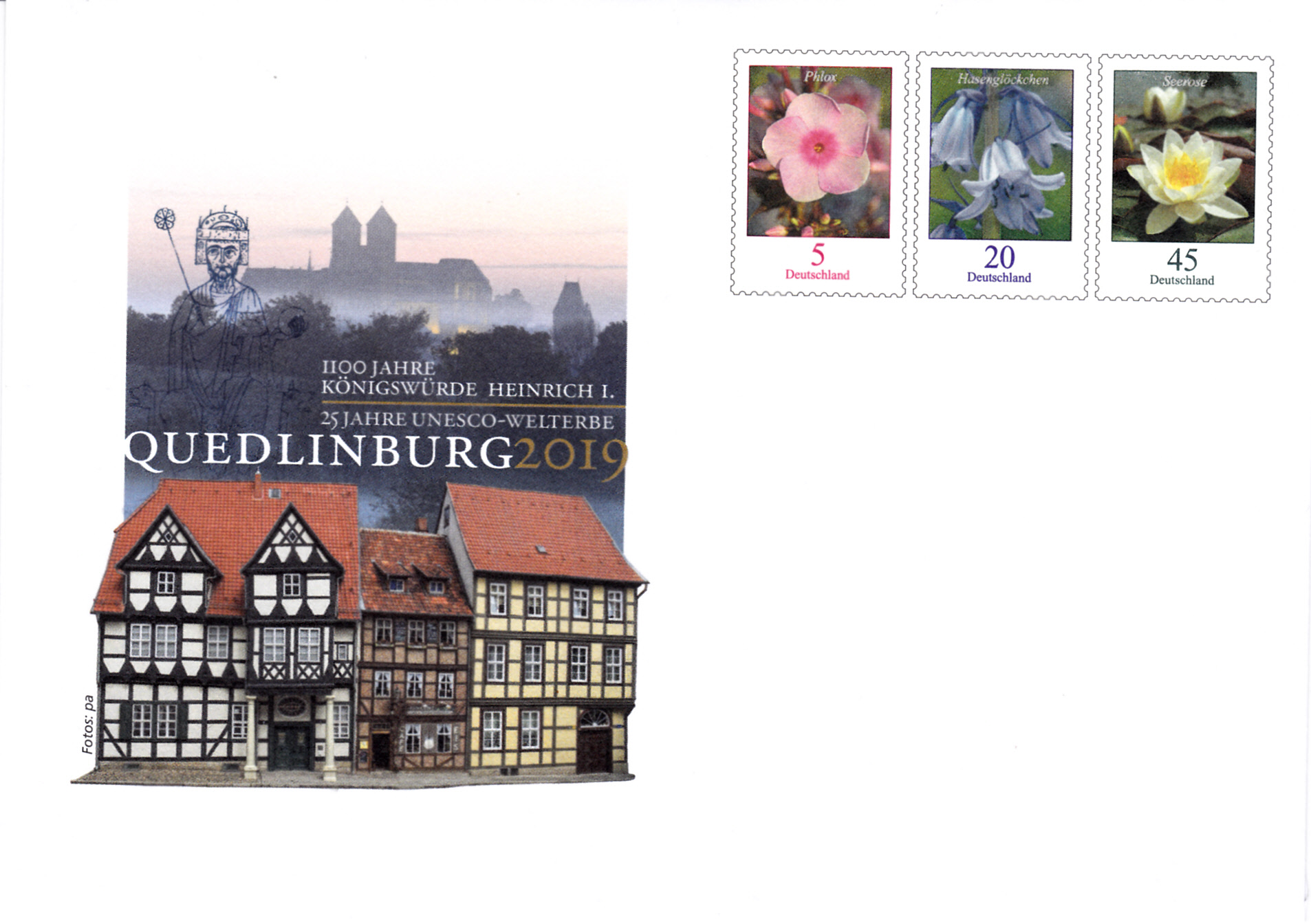 Diese Gedenkganzsache zum Thema "1100 Jahre Königswürde Heinrich I. und 25 Jahre Quedlinburg Welterbe" ist mit drei Wertstempel im Muster der Marken zu 5 Cent Phlox, 20 Cent Hasenglöckchen und 45 Cent Seerose freigemacht.