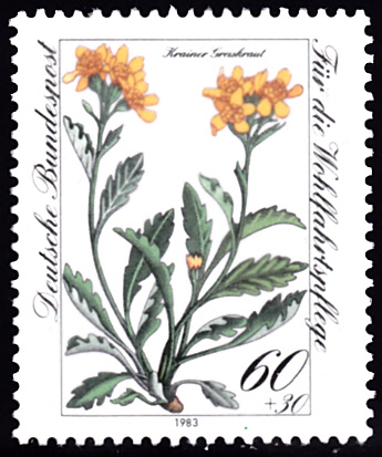 Hier zeige ich eine Marke aus der Wohlfahrtsmarkenserie 1983 (MiNr 1189) mit dem Krainer Greiskraut (Jacobaea incana subsp. carniolica).