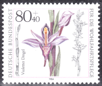 Auf einer Marke aus der Wohlfahrtsmarkenserie 1984 der Deutschen Bundespost (MiNr 1227) wird uns der Violette Dingel (Limodorum abortivum) gezeigt.
