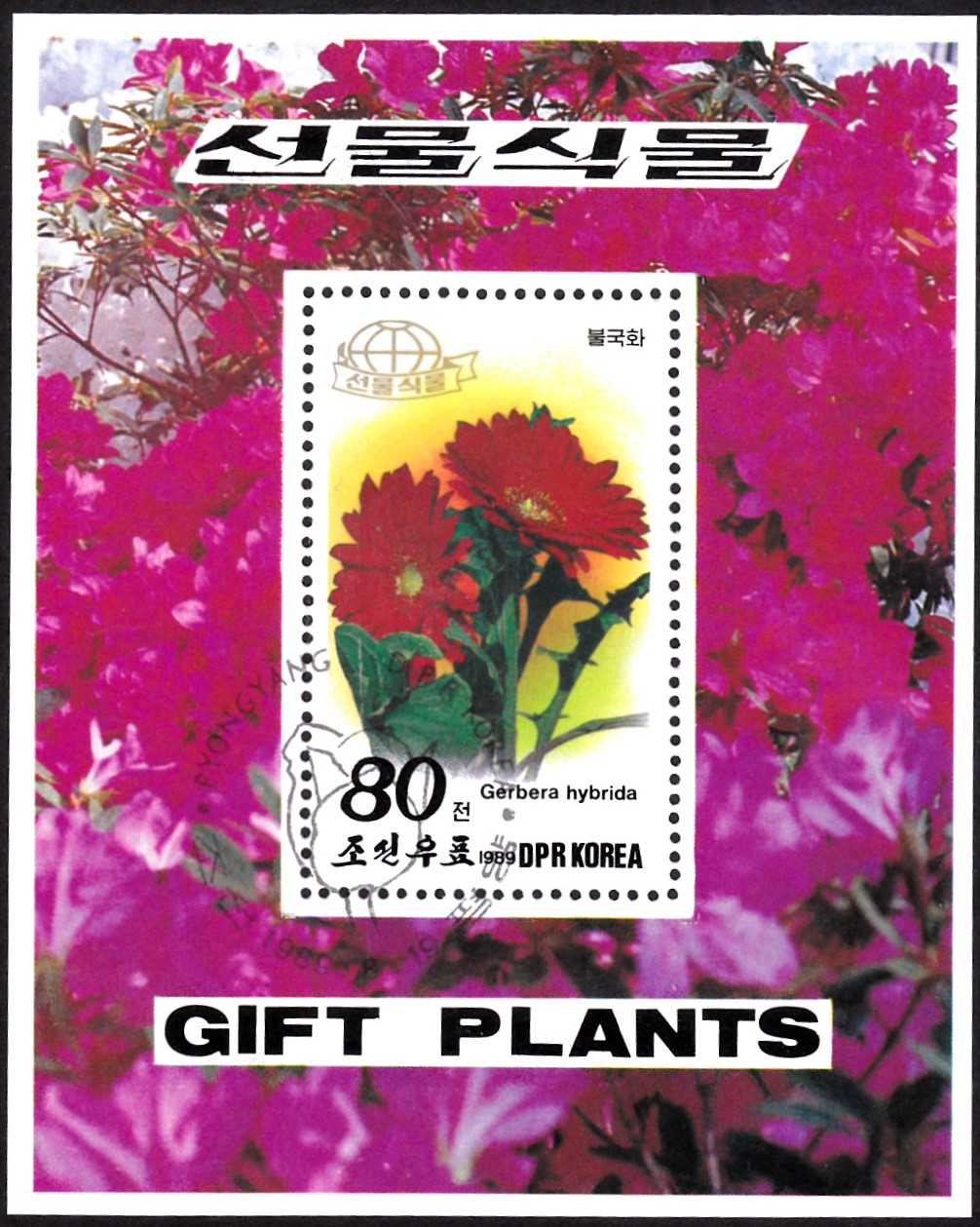 Auf dieser Marke (MiNr 3043) eines Blockes (MiNr Block 249) aus Nord-Korea wird eine Gerbera hybrida gezeigt.