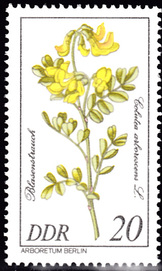 Auf dieser Marke der DDR (MiNr 2575) wird ein blühende Zweig der gelben oder gewöhnlichen Blasenstrauches (Colutea arborescens) gezeigt.