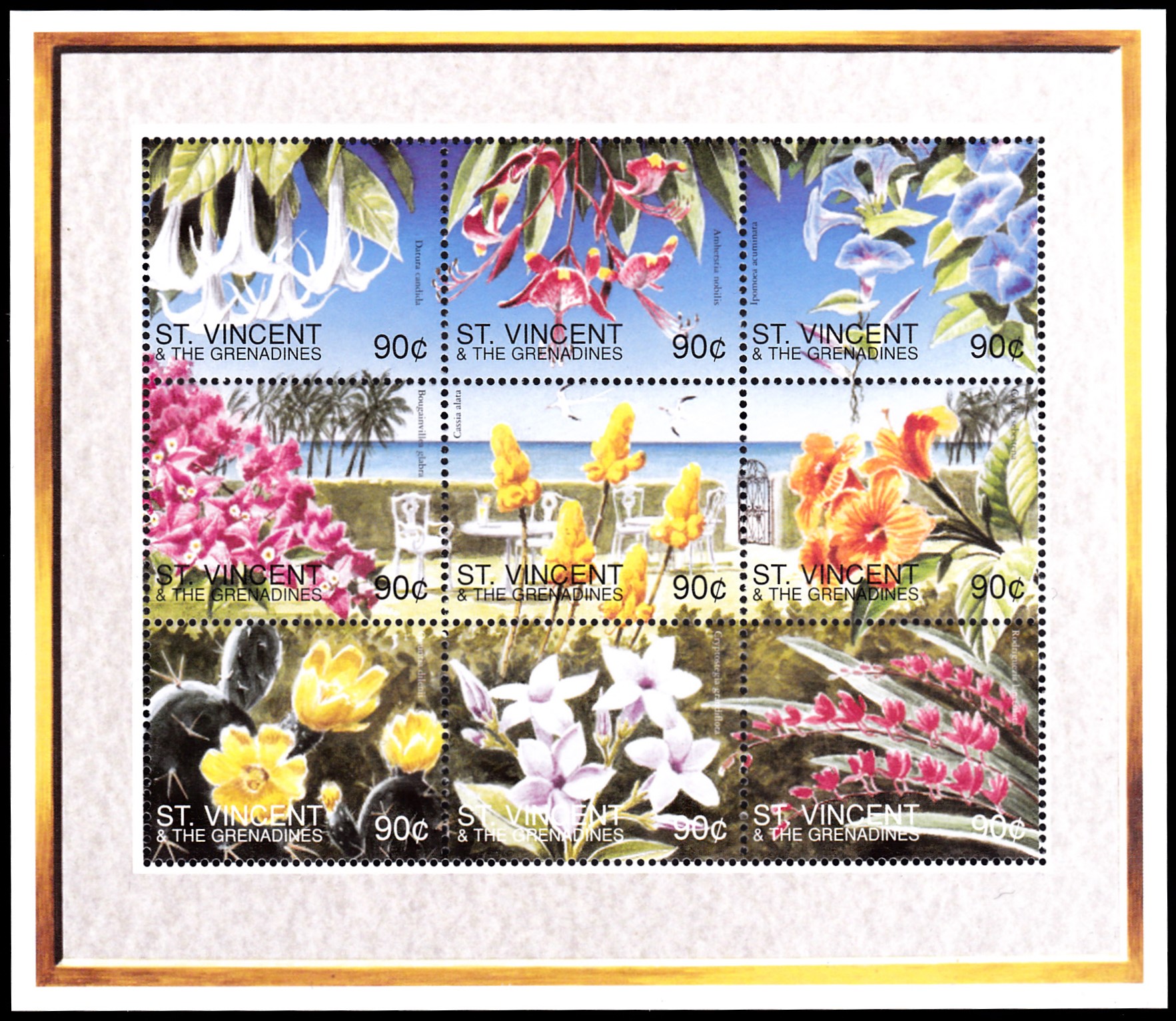 Diese Marke aus St. Vincent (MiNr 3707) zeigt uns Blüten der Cryptostegia grandiflora.