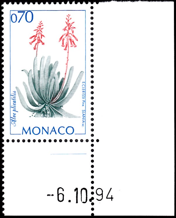 In Monaco ist diese Marke (MiNr 2211) mit einer Aloe plicatilis nach einem Aquarelle von Etienne Clérissi (1888-1971, monegassischer Maler) erschienen. Hier zeige ich ein Eckrandstück mit Druckdatum.