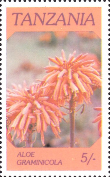 Auf dieser Marke aus Tansania (MiNr 325) sind Blüten der Aloe graminicola zu sehen.