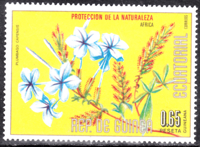 Aus Äquatorial-Guinea kommt diese Marke (MiNr 982) mit einem blühenden Zweig der Kap-Bleiwurz (Plumbago auriculata).