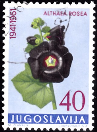 Aus Jugoslawien kommt diese Marke (MiNr 947) mit einer Gewöhnlichen Stockrose (Alcea rosea). Michel hat als Name die Version Stockmalve (Althaea rosea) gewählt.
