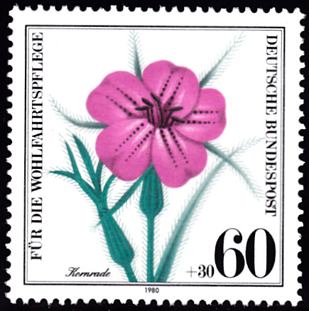 Eine Marke aus dem Wohlfahrtsmarkensatz der Deutschen Bundespost (MiNr 1061) zeigt eine Gewöhnliche Kornrade (Agrostemma githago).