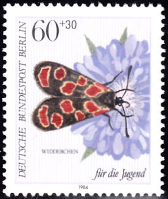 Auf dieser Jugendmarke 1984 aus Berlin (MiNr 713) sitzt ein Esparsetten-Widderchen auf der Blüte einer Acker-Witwenblume (Knautia arvensis).