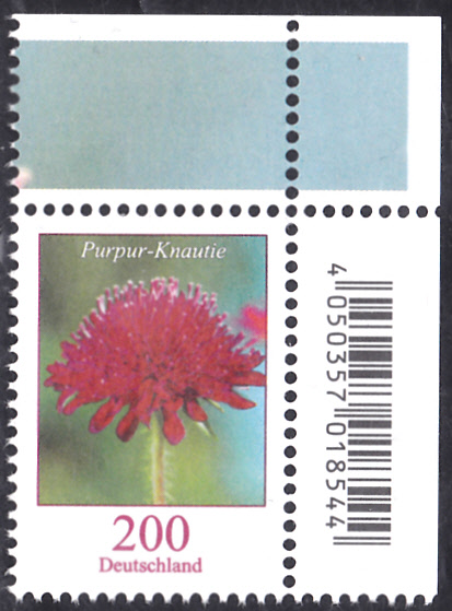 In der Dauerserie Blumen ist bei der Deutschen Post auch eine Marke (MiNr 3556) erschienen. Hier zeige ich ein Eckrandstück mit EAN-Code.