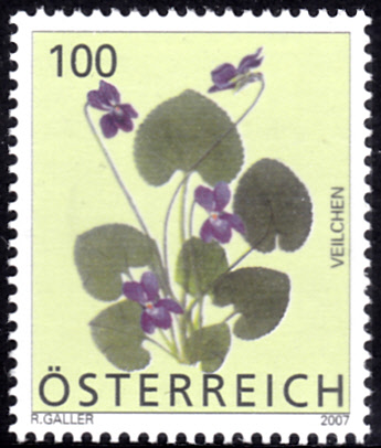 Diese Marke aus Österreich (MiNr 2652) zeigt ein blühendes Duftveilchen (Viola odorata).