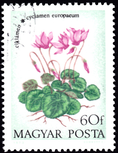 Ein Europäisches Alpenveilchen (Cyclamen purpurascens; Syn.: Cyclamen europaeum), das auch Wildes Alpenveilchen, Zyklame (von lateinisch Cyclamen), Erdscheibe oder Erdbrot sowie kurz Alpenveilchen genannt wird, zeigt diese Marke aus einer Serie "Feldblumen" aus Ungarn (MiNr 2888 A).