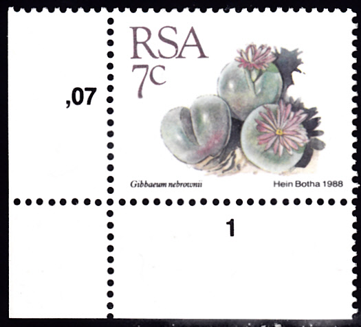 Diese Marke (MiNr 746) bildet eine blühende Gibbaeum newbrownii ab.