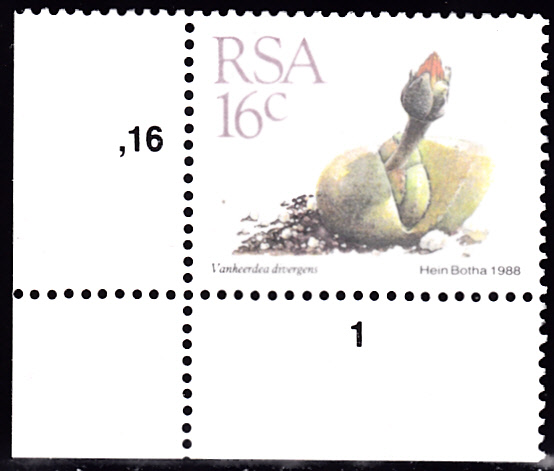 Auf dieser Marke aus Südafrika (MiNr 748) ist eine Vanheerdea divergens abgebildet.