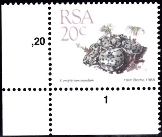 Auf dieser Marke (MiNr 749) wird die Unterart Conophytum obcordellum mundum gezeigt.