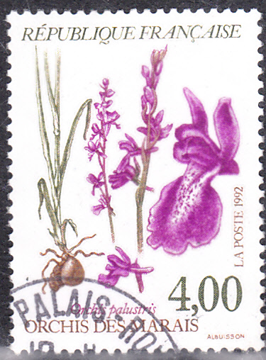 Auf einer Marke aus Frankreich (MiNr 2912) sehen wir Abbildungen zum Sumpf-Knabenkraut (Anacamptis palustris).