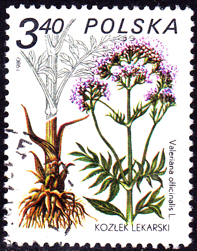 Auch Polen zeigt auf einer Marke (MiNr 2708) den Echten Baldrian (Valeriana officinalis). Michel nennt als Name Gemeiner Baldrian (Valeriana officinalis).