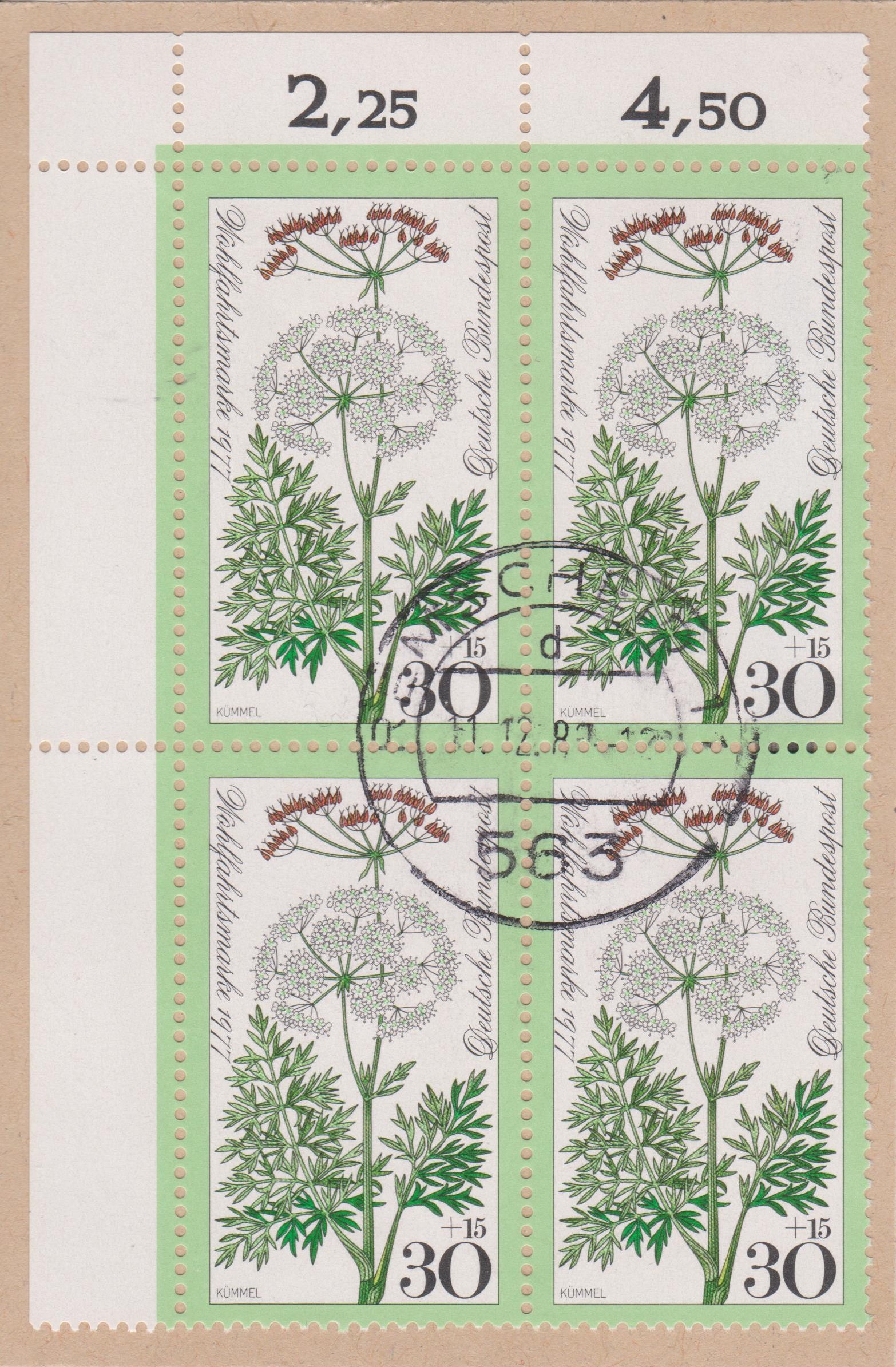 KÜMMEL, Bund MiNr. 949, als Viererblock aus der linken oberen Bogenecke auf Briefstück, entwertet mit Tagesstempel "563 REMSCHEID 1":