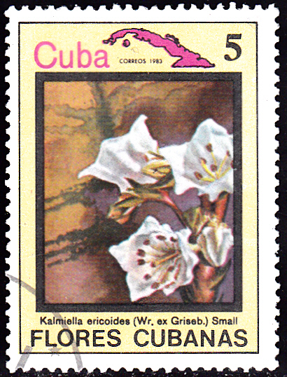 Auf dieser Marke aus Kuba (MiNr 2786) werden Blüten einer Kubanischen Lorbeerrose (Kalmia ericoides) gezeigt.