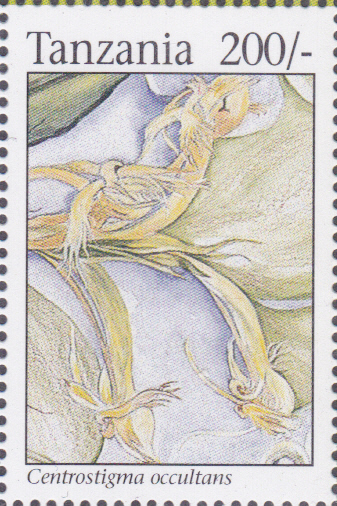 Aus Tansania kommt diese Marke (MiNr 1872) mit einer Centrostigma occultans.