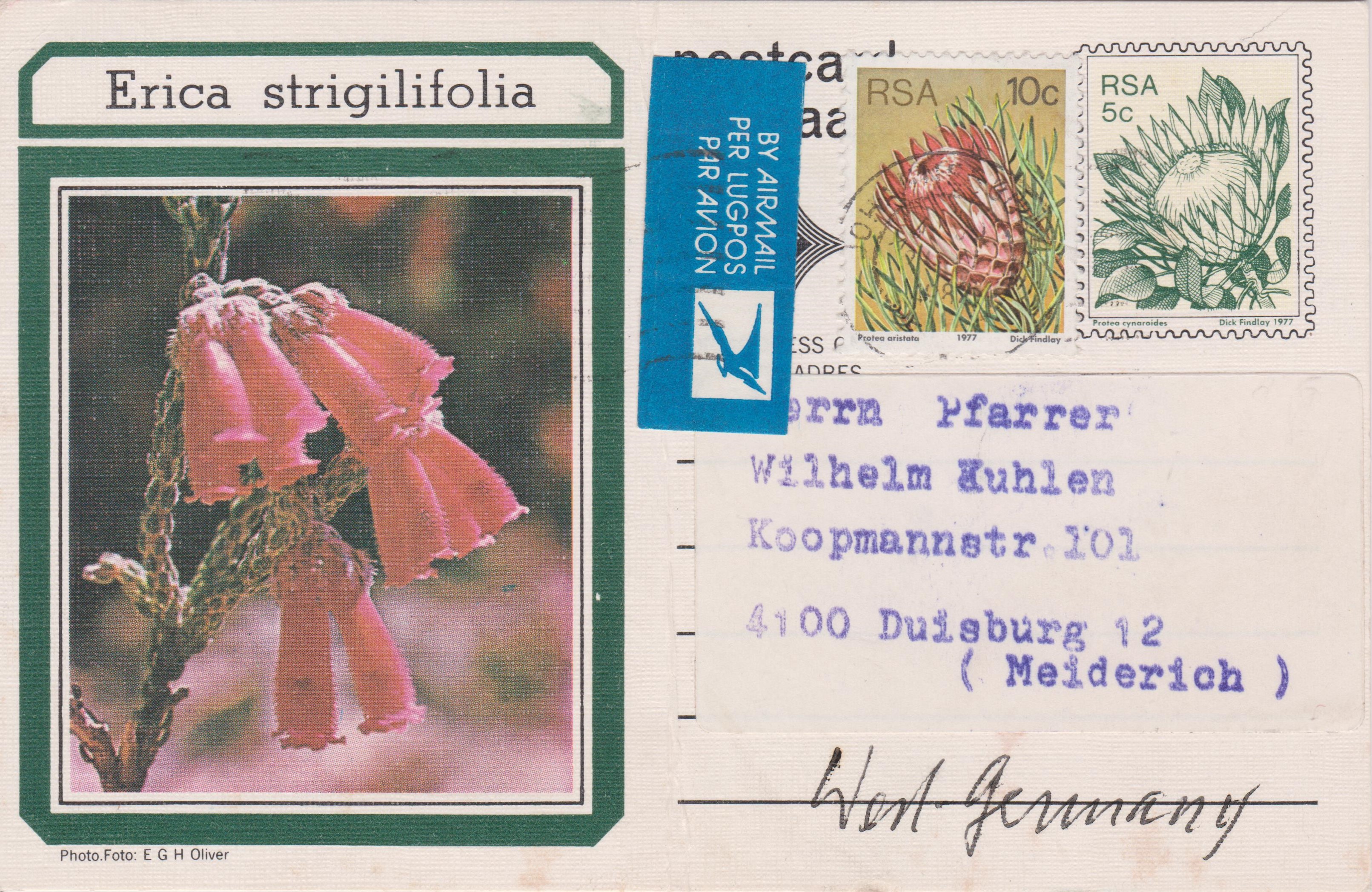 Diese Ganzsache, eine Postkarte aus Südafrika (= RSA) zeigt ein Foto einer Erica strigilifolia: