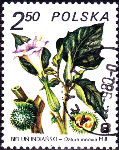 In Polen ist diese Marke (MiNr 2707) mit dem Großblütigen Stechapfel (Datura inoxia) erschienen. Michel nennt als Namen Unschädlicher Stechapfel (Datura innoxia).