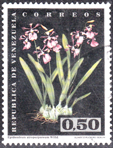 Auf dieser Marke aus Venezuela (MiNr 1439) sehen wir eine blühende Epidendrum atropurpureum. Michel gibt den Namen als Epidendrum atropureum an.