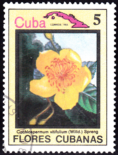 Auf einer Marke aus Kuba (MiNr 2784) wird eine Blüte des Butterblumenbaumes (Cochlospermum vitifolium) gezeigt.