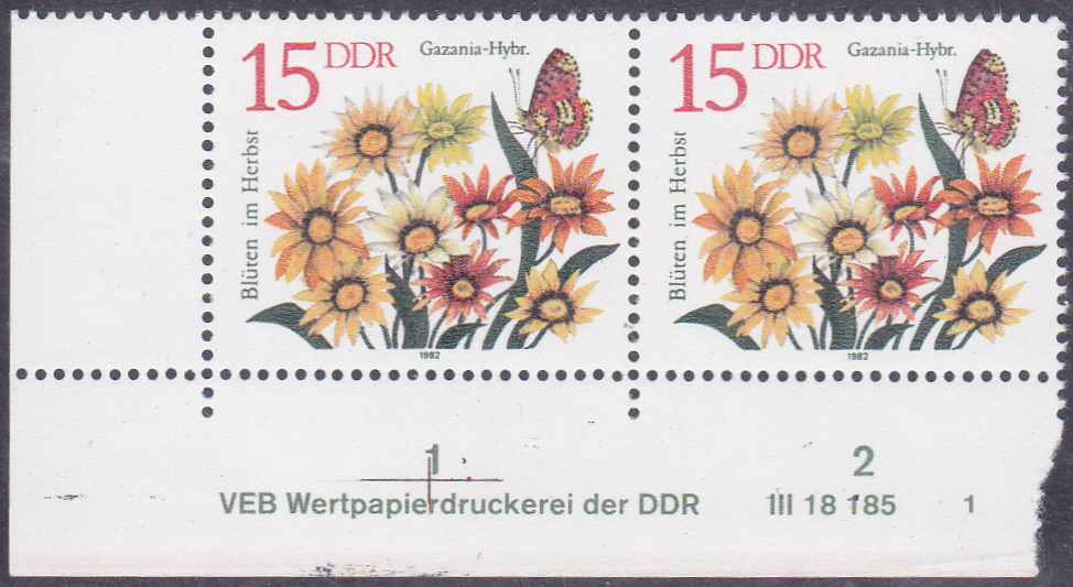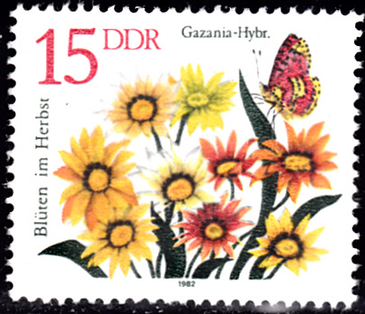 In Südafrika gibt es mehrere Marken mit Blüten einer Gazania krebsiana im Markenbild. Aus der Vielzahl der Marken (zeige ich hier eine selbstklebende Marke mit zweisprachiger Länderbezeichnung aus einem Markenheftchen (MiNr 1348 II BC).