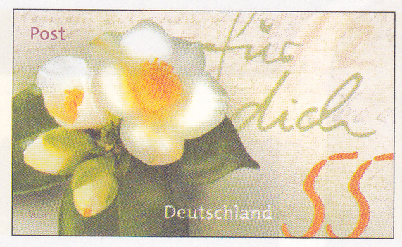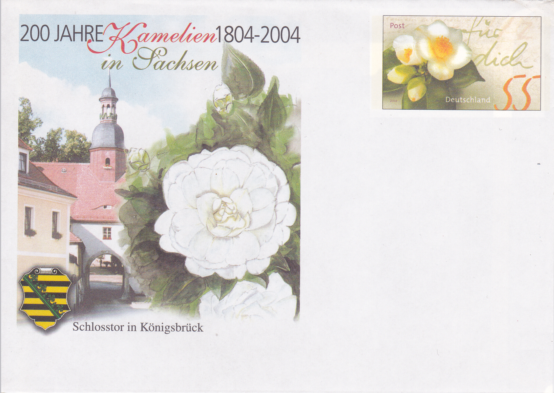 Dieser "Gedenkumschlag" (MiNr USo 78) mit einem Wertstempel im Muster der Marke "Kameliengruß" (MiNr 2414) wurde zum Jubiläum "200 Jahre Kamelien in Sachsen" 2004 herausgegeben.