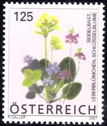 Auf dieser Marke aus Österreich (MiNr 2633) werden gleich drei verschiedene Blütenpflanzen gezeigt: das Dreilappige Leberblümchen (Hepatica nobilis), die Hohe Schlüsselblume (Primula elatior), und der Gewöhnliche Seidelbast (Daphne mezereum).