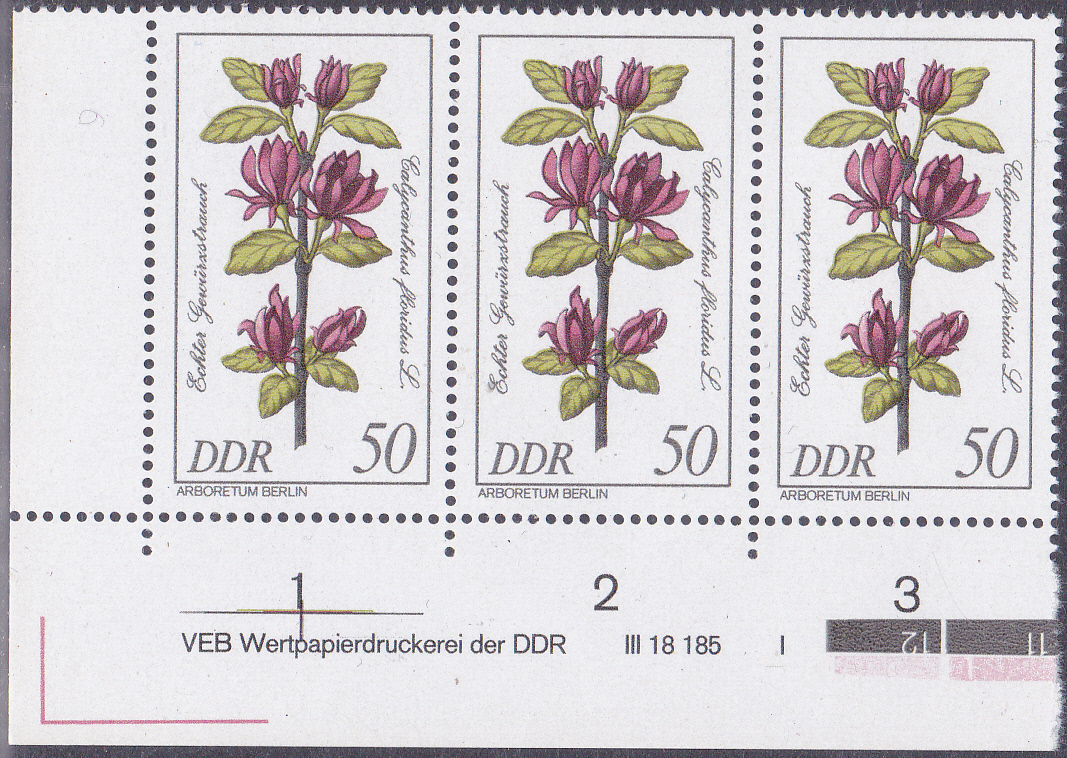 Auf dieser Marke der DDR (MiNr 2578) wird ein Zweig des Echte Gewürzstrauches (Calycanthus floridus) gezeigt.