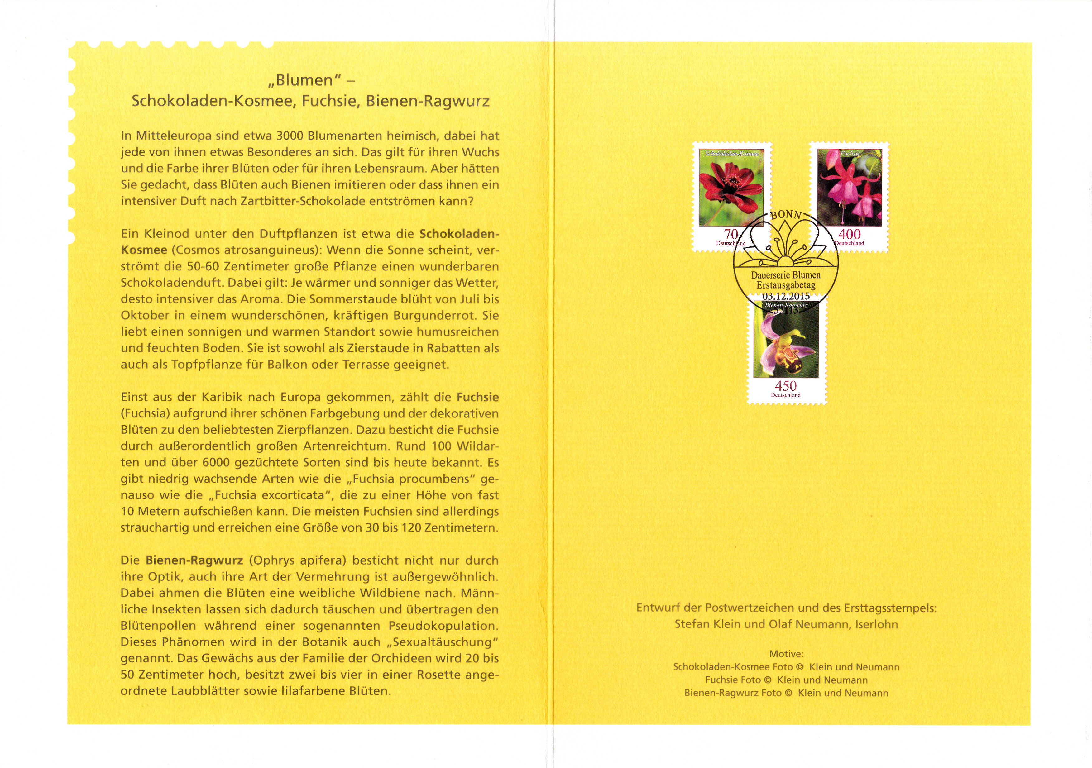 Klappkarte vom Vorsitzenden des Vorstands der Deutschen Post AG mit der Marke der Dauerserie "Blumen" (MiNr 3190) mit der Blüte einer Bienen-Ragwurz (Ophrys apifera) mit dem Ersttagsonderstempel aus Bonn.