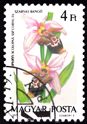 Hier zeige ich eine Marke aus Ungarn (MiNr 3924 A) mit der Abbildung einer Kleinblütigen Gehörnten Ragwurz (Ophrys scolopax subsp. cornuta; Syn.: Ophrys oestrifera subsp. cornutula). Sie kommt auf der Balkanhalbinsel und in der Ägäis vor.